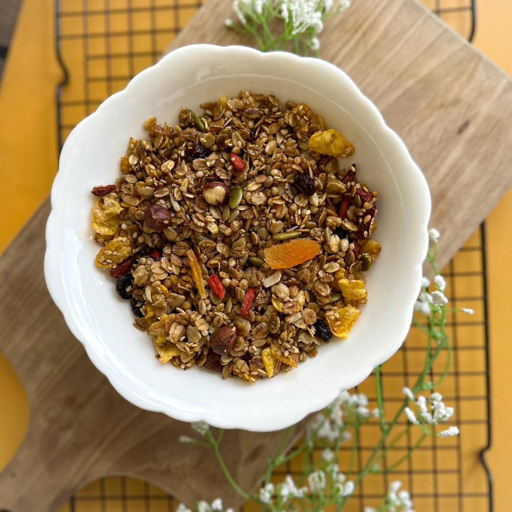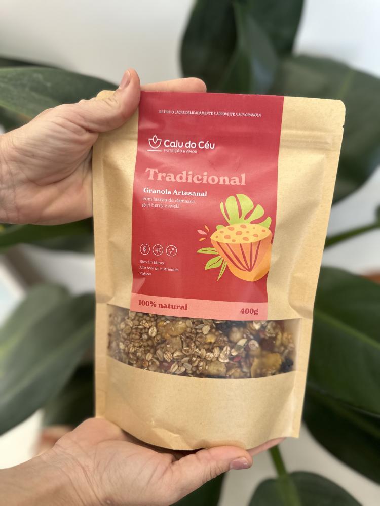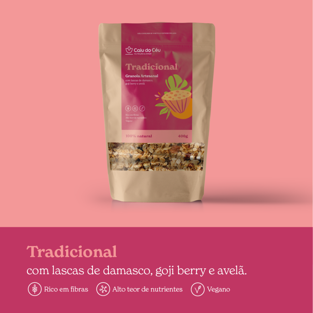 Granola tradicional de flocos de cereais integrais, à moda clássica de se fazer granola (muesli): assadas ao forno, com melado de cana (usamos melado orgânico certificado) e com ingredientes cuidadosamente selecionados a partir de suas qualidades nutracêuticas. A união de lascas de damasco cortadas manualmente, com avelãs assadas inteiras, goji berry e um toque de cardamomo deixa essa granola como uma das mais queridinha de nossos clientes.